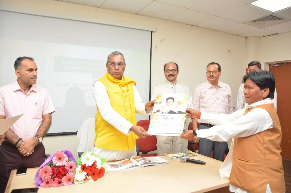 Shri Om Prakash Rajbhar, Hon’ble Minister of Panchayati Raj, Uttar Pradesh, unveiling the coffee table book Viksit Panchayat – Viksit Bharat
