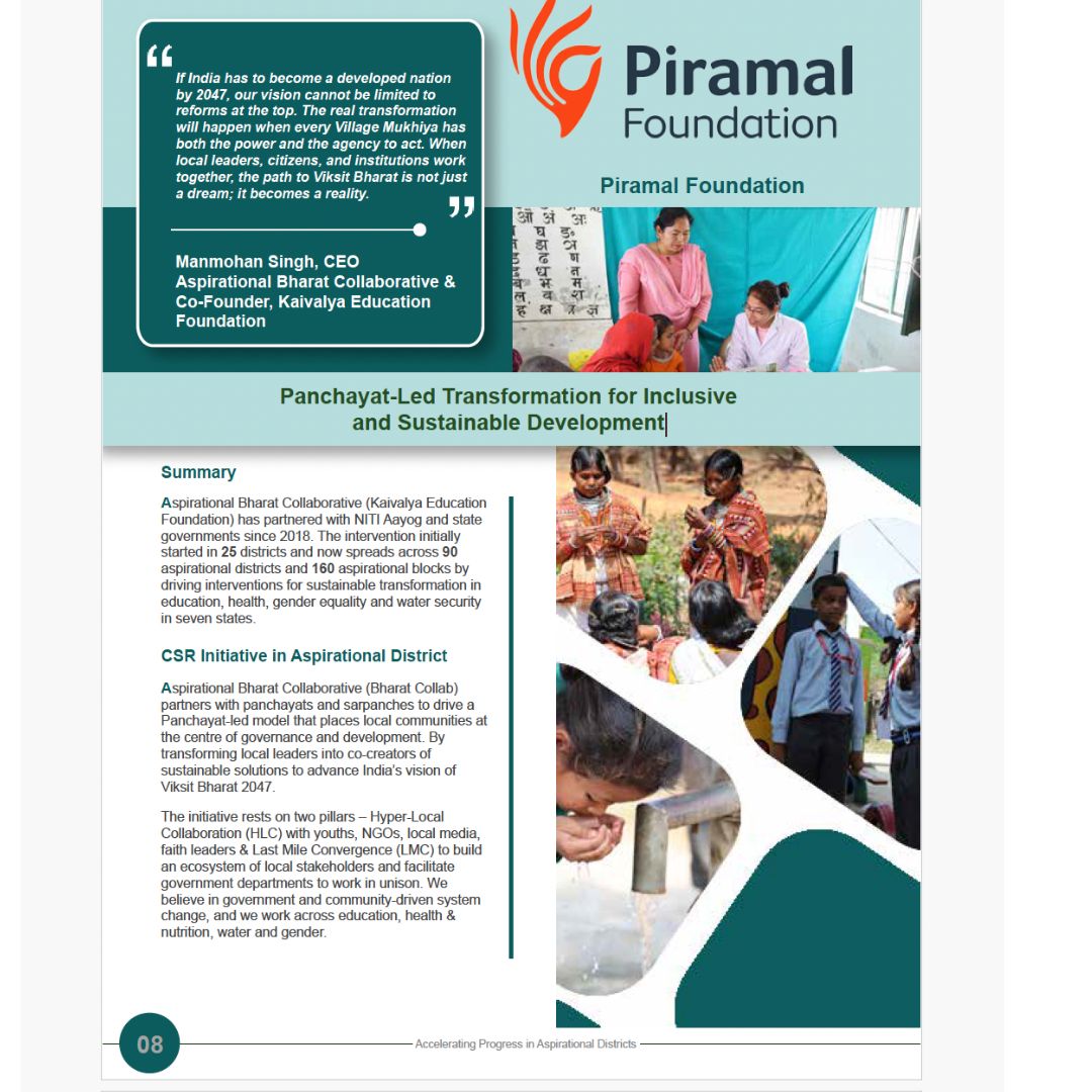 The Aspirational Bharat Collaborative represents a synergistic partnership between NITI Aayog and Piramal Foundation. Transitioning from its precursor, (Aspirational Districts Collaborative), it is a renewed endeavour focused on working with District Administrations to facilitate Last Mile Convergence and Hyper-Local Collaboration. We have deployed teams in 150+ districts to support District Administrations to address complex demographic, geographic, and socio-economic issues of India’s most backward districts.